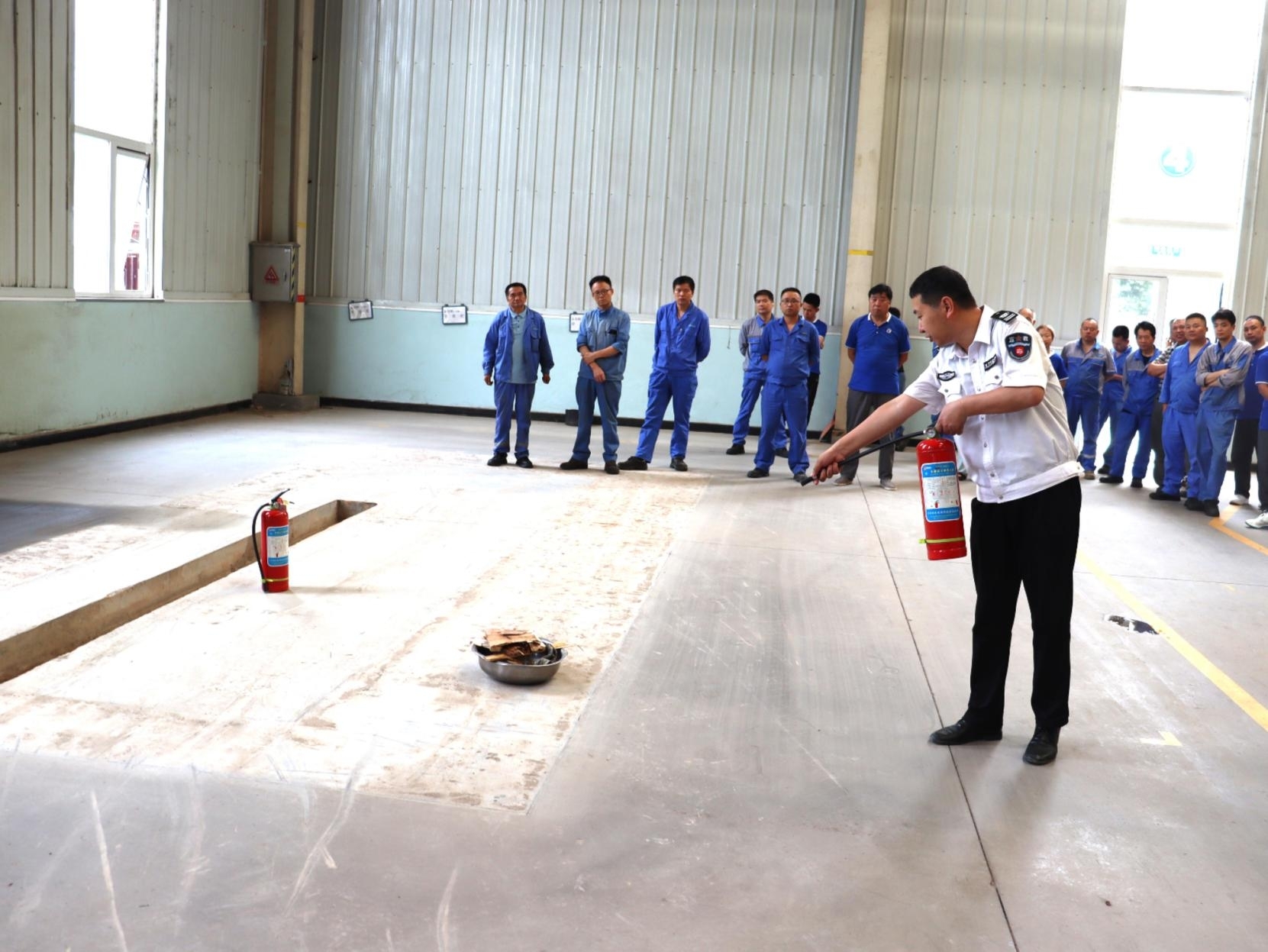培訓(xùn)結(jié)束后,全體參加培訓(xùn)人員轉(zhuǎn)移到一號(hào)車間,在培訓(xùn)老師演示、指導(dǎo)下,完成了干粉滅火器實(shí)際操作的演練。